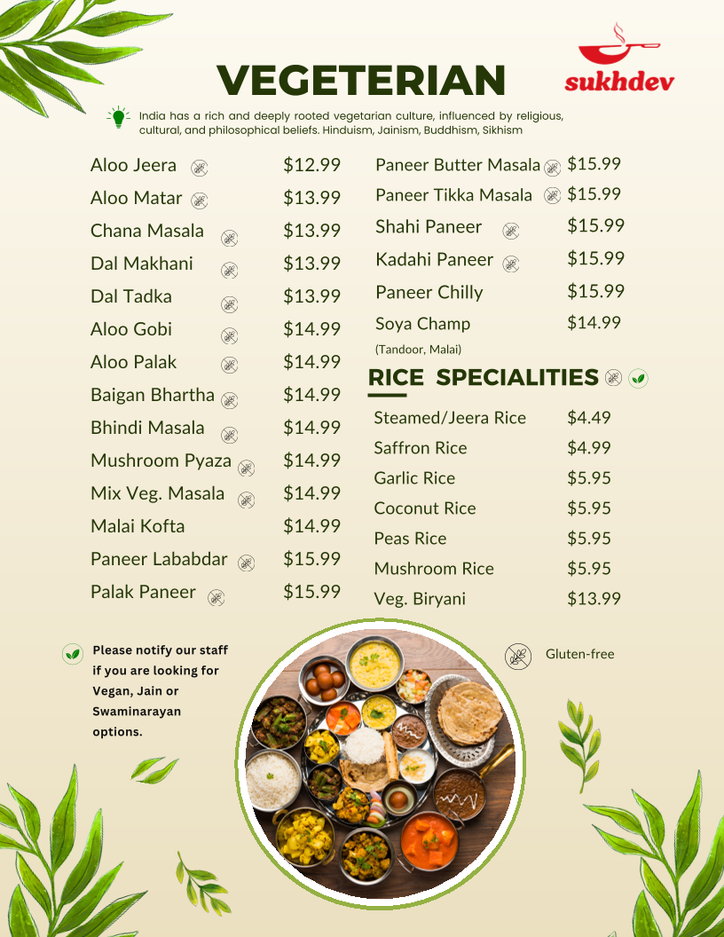 Every meal is complemented perfectly by delightful sides such as Laccha Pyaaz and Mixed Raita, which add that extra layer of authenticity and flavor. And let's not forget about the desserts! Sukhdev offers a tempting selection that includes the luscious Ras Malai, Gulab Jamun, and Kheer—each a sweet testament to Indian culinary art that will undoubtedly leave you craving more.